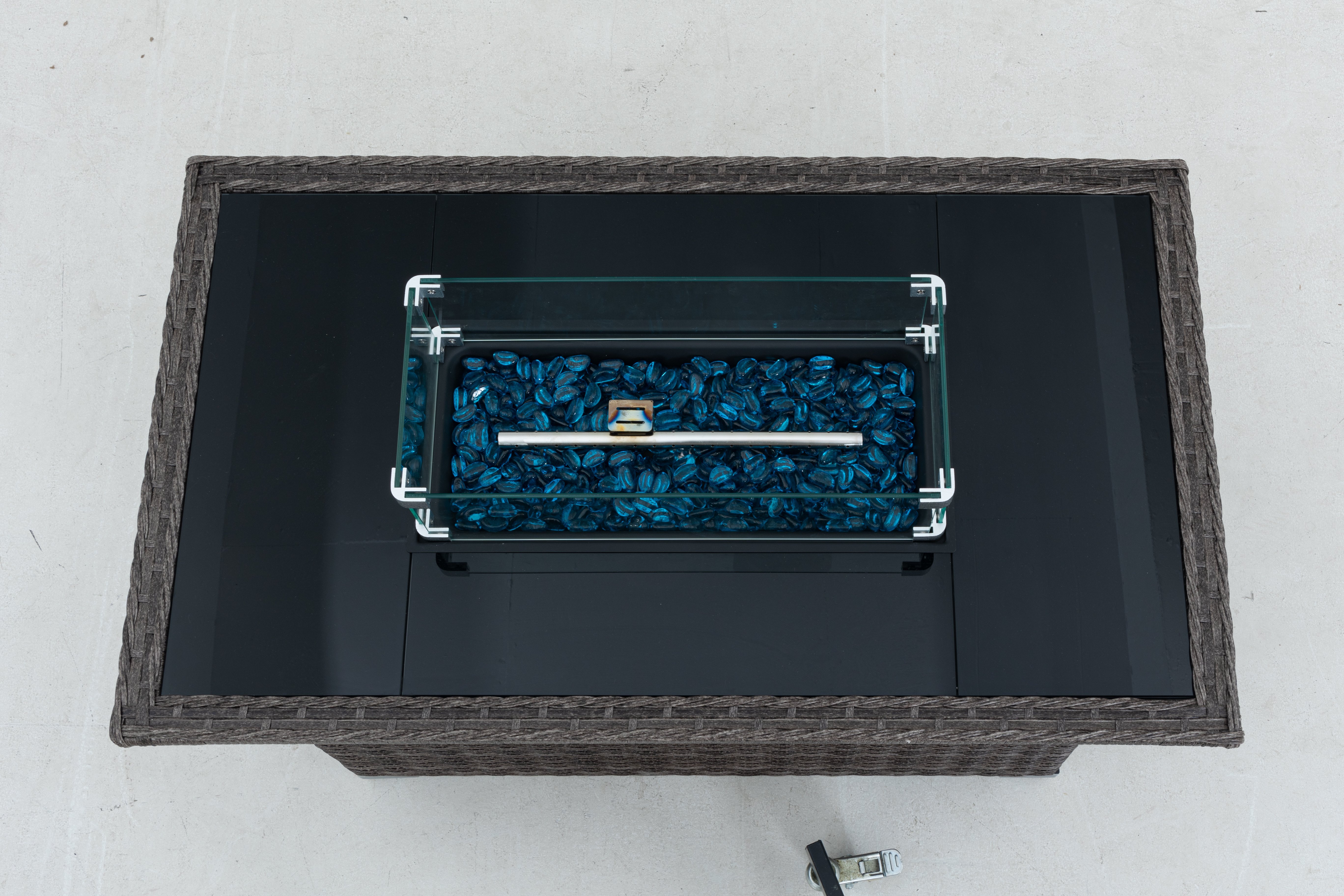 It is featuring a stylish hearth, this fire pit is complete with an elegant simulated wicker table base, making it an attractive centerpiece for your any outdoor living space.