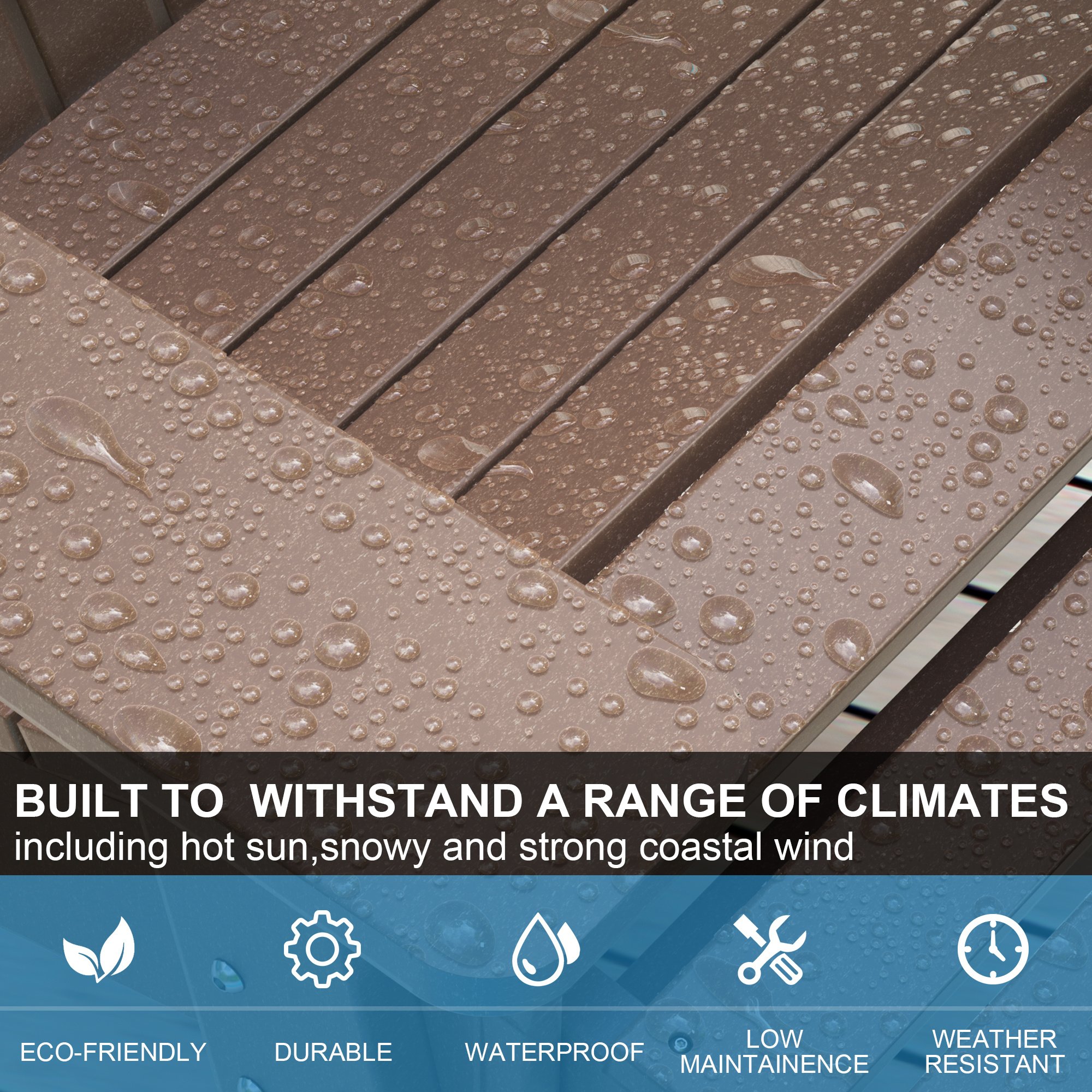 1.[Natural Appearance & Weatherproof Material] We use recycled High Density Polyethylene material for the whole chair. It looks like wood but it's not wood. It has a natural appearance and doesn't look "plastic-y." This HDPE material lasts longer than the wood as it has a great reputation for the abrasion resistance performance. This HDPE material chair perfectly withstands hot summers and freezing winters.