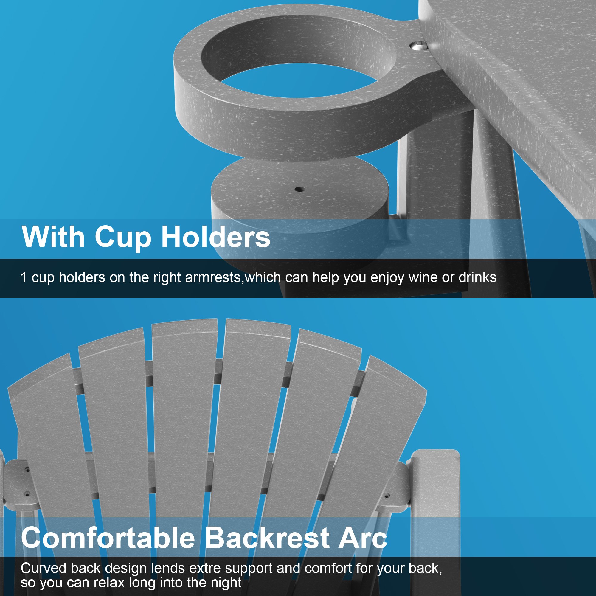 5.[1 Cup Holder & Comfortable Backrest]Our Adirondack chair conform to Ergonomic design ; which is with 1 cup holders on the right armrests; which can help you enjoy wine or drinks.Our Adirondack chair Curved back design lends extre support and comfort for your back; so you can relax long into the night