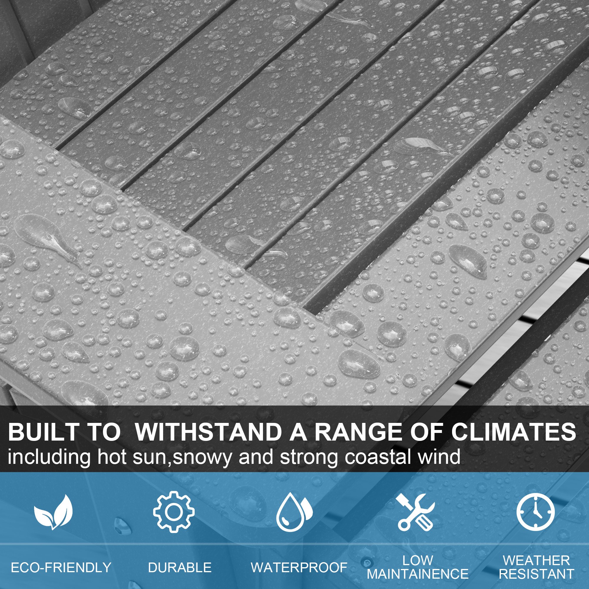 1.[Natural Appearance & Weatherproof Material] We use recycled High Density Polyethylene material for the whole chair. It looks like wood but it's not wood. It has a natural appearance and doesn't look "plastic-y." This HDPE material lasts longer than the wood as it has a great reputation for the abrasion resistance performance. This HDPE material chair perfectly withstands hot summers and freezing winters.