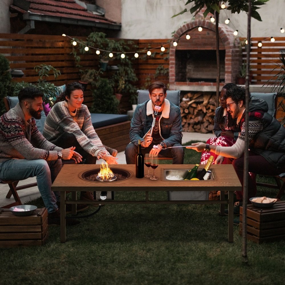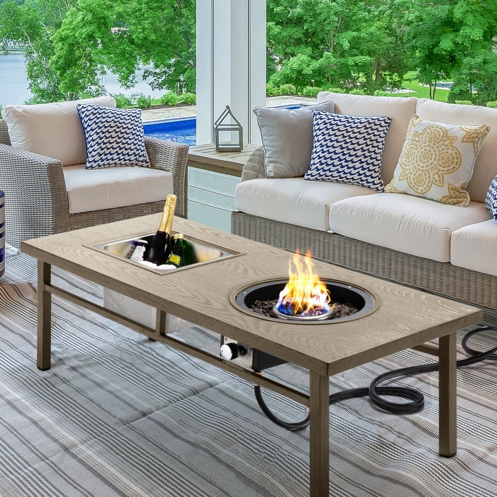 Product Material:Crafted from 304 stainless steel, our ice bucket boasts double walls and a lid, keeping your drinks chilled for a longer time. Its sleek silver finish not only adds a touch of elegance but also ensures easy cleaning. Our coffee table boasts a robust aluminum frame, ensuring long-lasting reliability. We've replaced the fragile glass and rattan tabletop with an aluminum panel, making it safer and easier to clean than other materials.Product Design:Our CSA-certified gas fire pit table provides a clean and smokeless burn. The piezo ignition ensures easy control, and the included volcanic rocks help retain warmth longer while adding a classic rustic atmosphere. A practical fire pit table for warm gatherings, a refreshing ice bucket table for chilled beverages, and a stylish coffee table for cherished moments. Elevate your outdoor experience with this space-saving design.