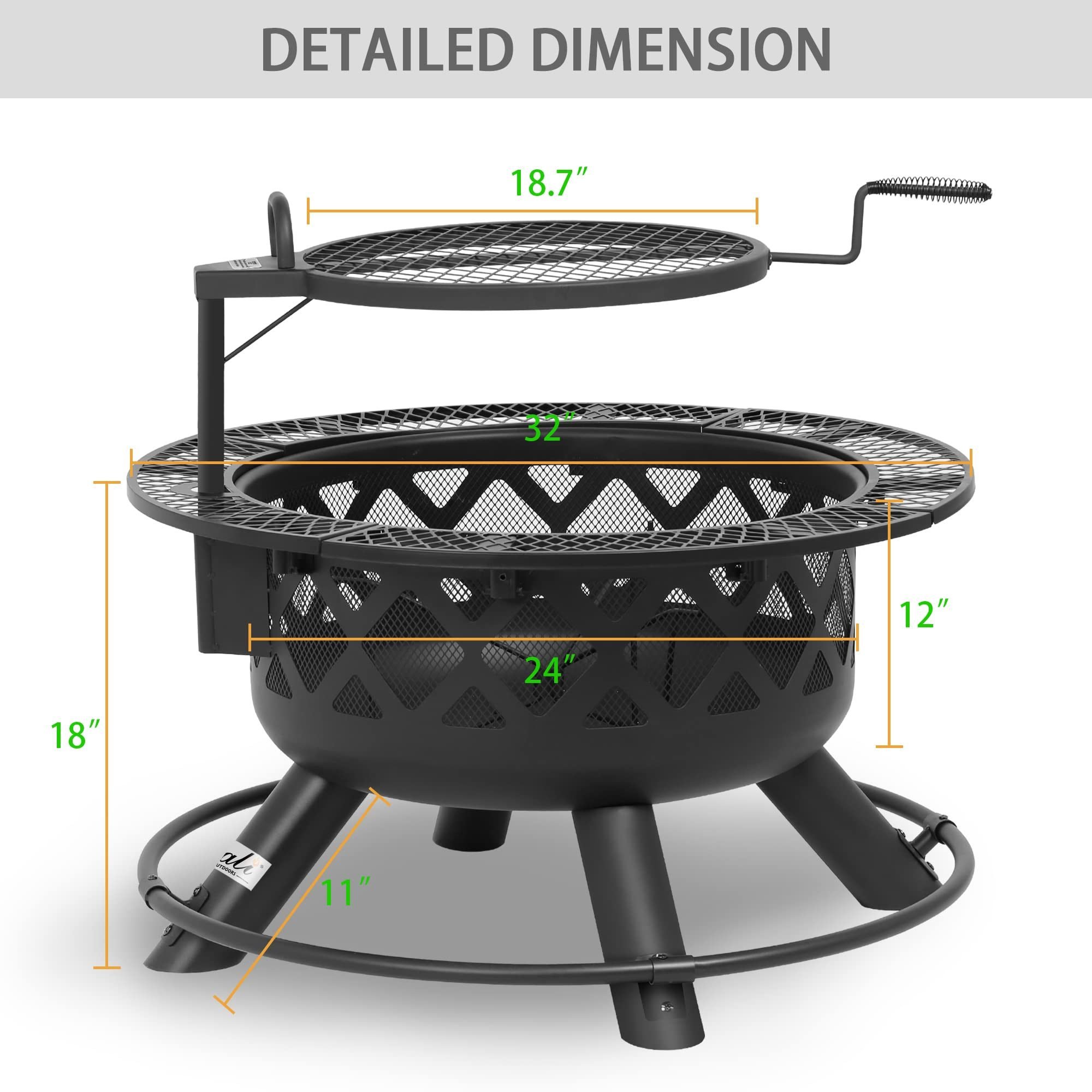 Multi-Functional Design: Grill swivels 360 degrees, make swing it left or right possible. Grill adjusts up and down, fixed by screws. Remove the grill with built-in handles at both ends, and you have one wood burning fire pit